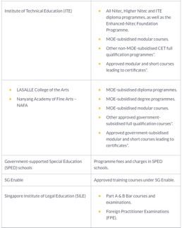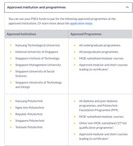 From May 08, a child can use his PSEA funds to pay for his own or his siblings' approved fees and charges for approved programmes conducted by the institutions indicated in the table below.